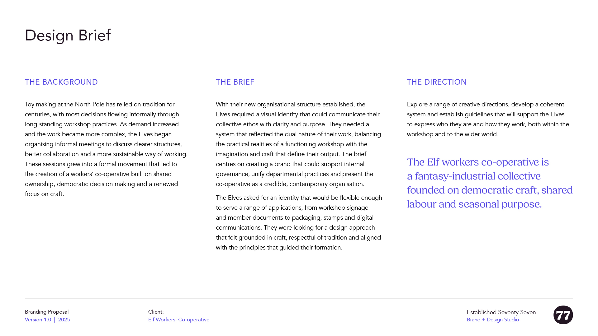 First, nothing overly festive or hokey. I wanted to avoid sparkles, fairy dust, and visual clichés. The world needed to feel functional and believable. Second, the socialist, co-operative nature of the organisation had to be foundational. This wouldn’t be just a decorative motif layered on top of the brand. It needed to influence language, structure, hierarchy, and values throughout the system. Third, no literal elves in the imagery. Elves could exist only as stylised, illustrative elements. This was about building an organisation and a culture, not creating characters.
