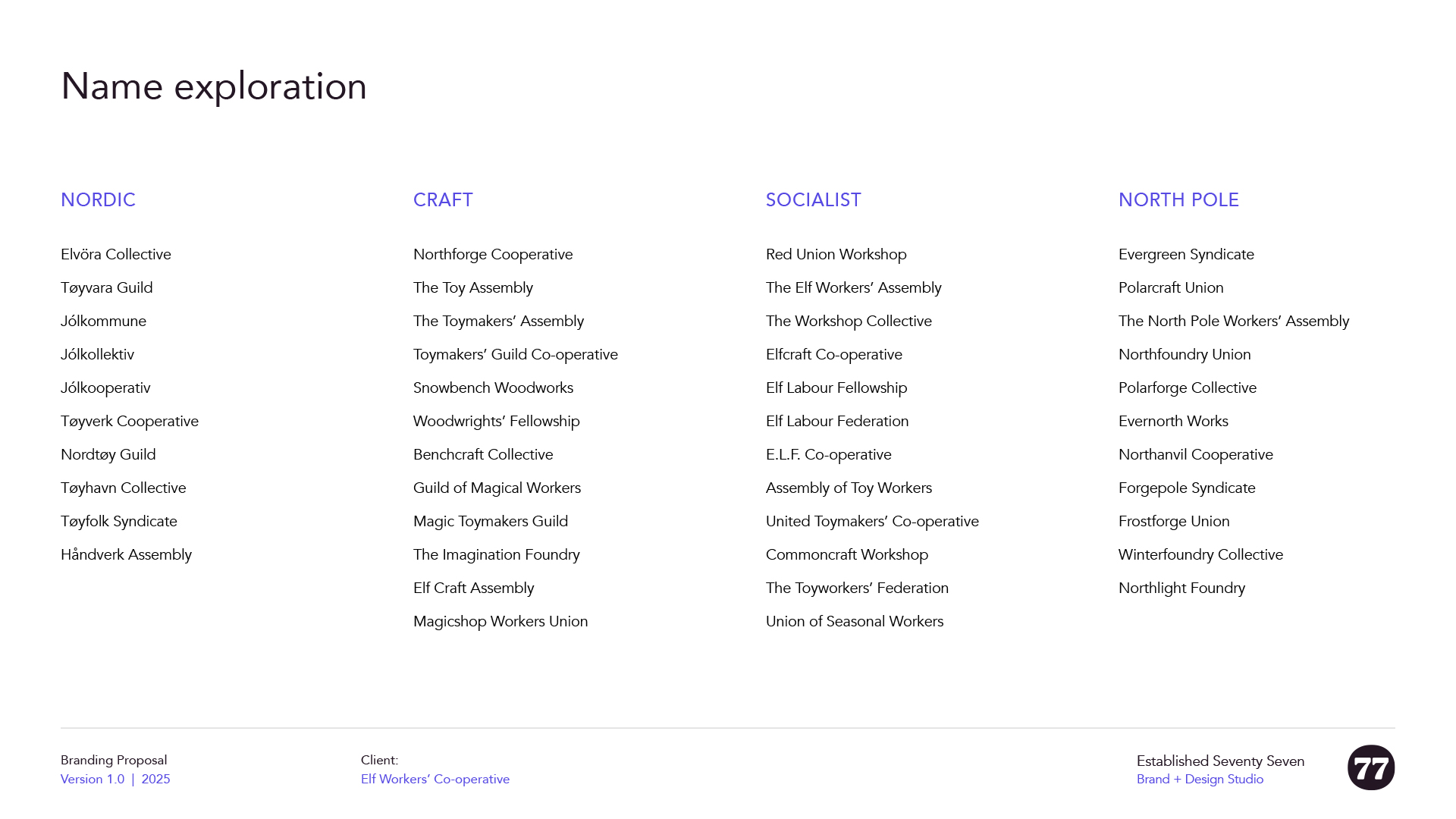 I explored a wide range of options, from folklore-led and Nordic-influenced names through to guilds, unions, and co-operative structures. That breadth helped clarify what I didn’t want just as much as what I did.