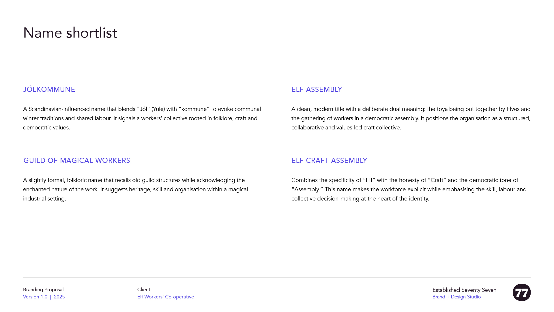 It places the Elves at the centre of the organisation (rather the end product as with The Toy Assembly). It signals a Christmas context immediately, without novelty. “Assembly” carries connotations of buidling, gathering, and collective decision-making, all of which aligned neatly with the project’s values. There is also a subtle familiarity to it, echoing the phrase “self assembly,” which helps the name land quickly.